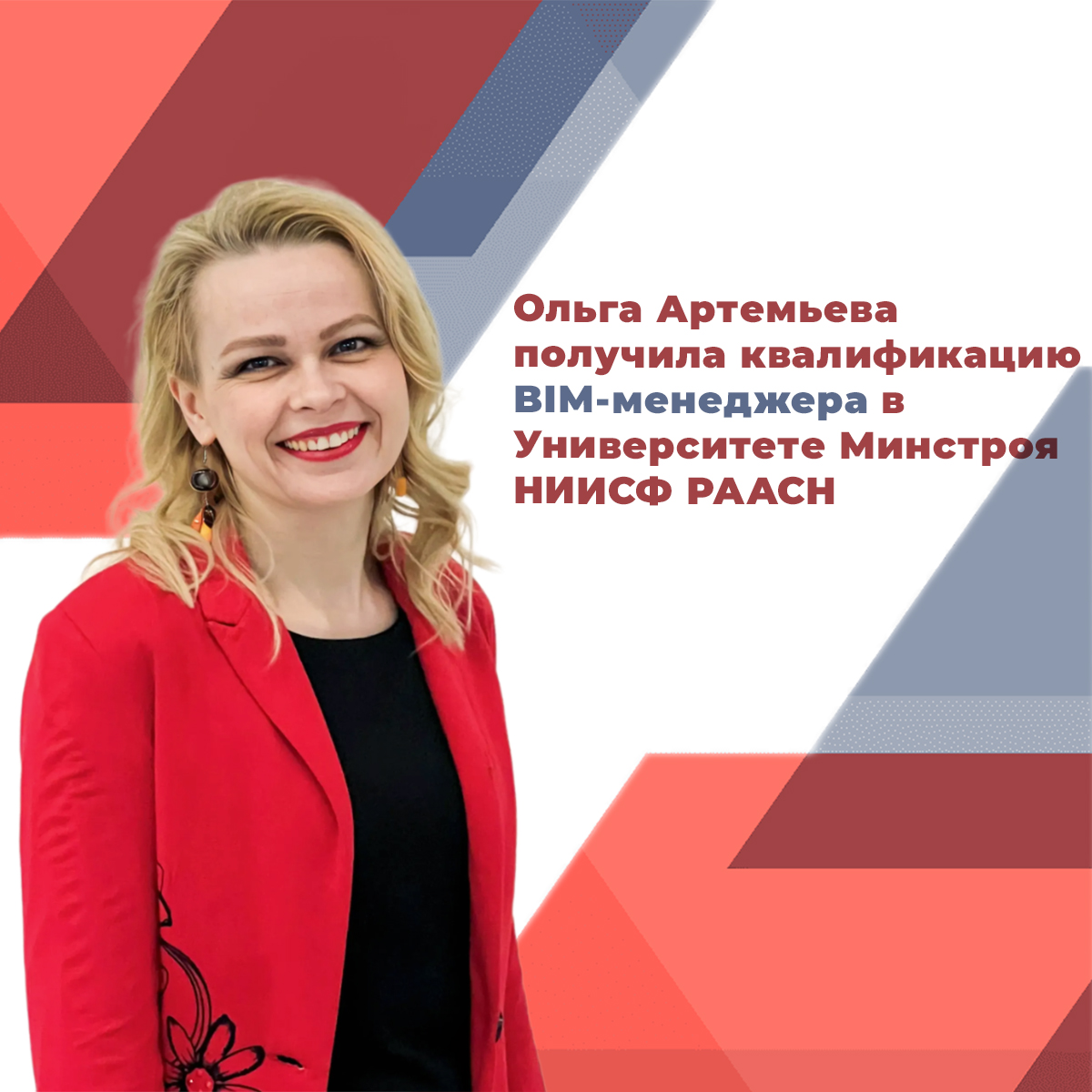 Наш ведущий специалист Ольга Артемьева успешно завершила обучение в Университете Минстроя НИИСФ РААСН и получила квалификацию BIM-менеджера. Это важный шаг в развитии компании, который позволит нам предложить вам решения нового уровня и качества.