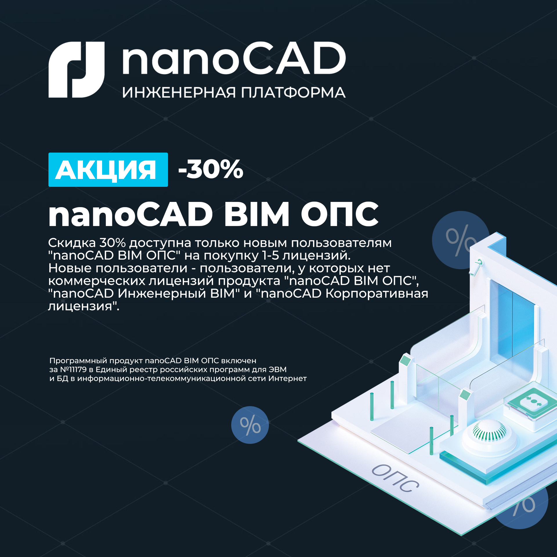 Срок действия акции на покупку nanoCAD BIM ОПС со скидкой 30% продлён до 30 июня 2026 года.